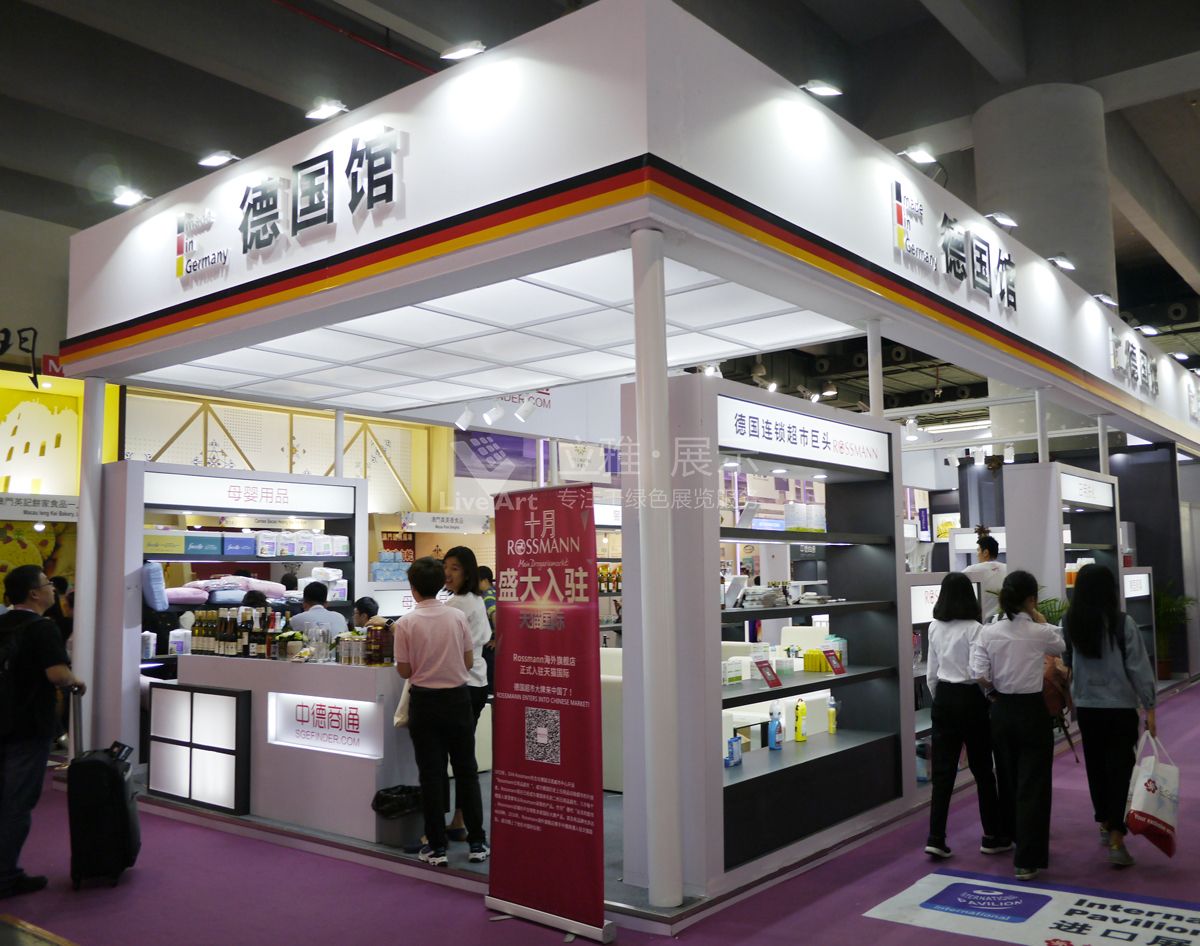 1中德商通展臺搭建:鐵架結(jié)合熱轉(zhuǎn)印拉布門頭,頂部為軟膜燈箱