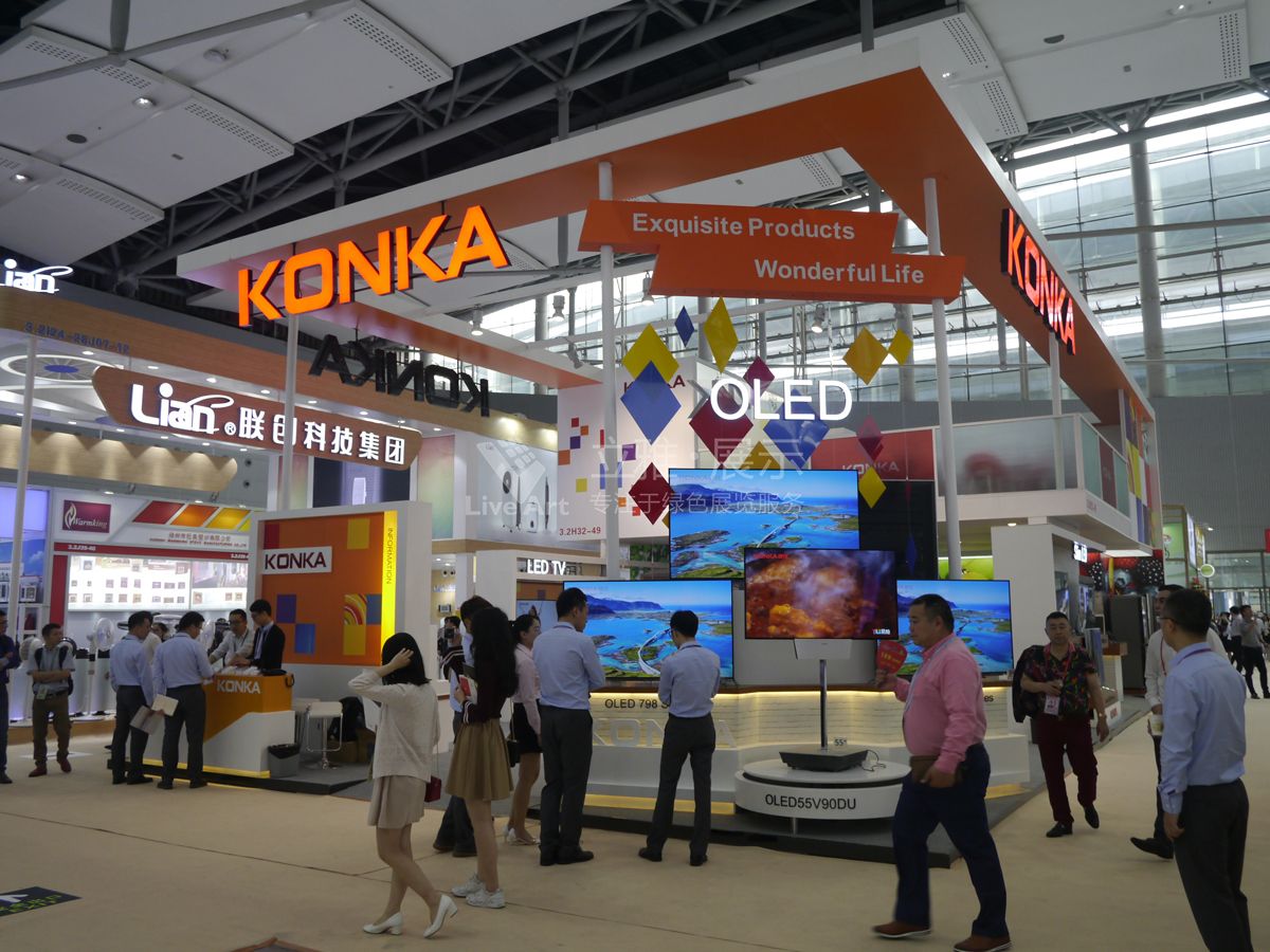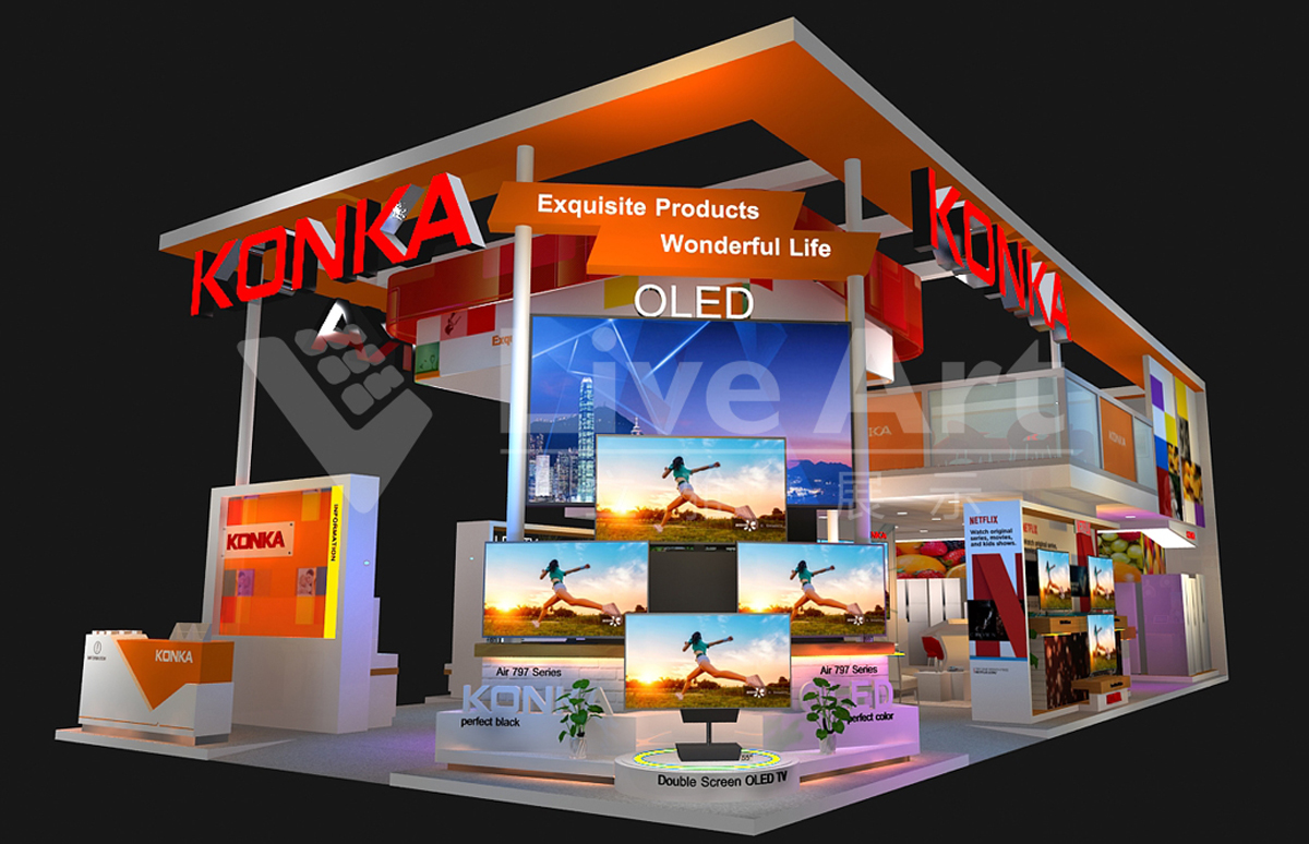2康佳展臺搭建:雙層結(jié)構(gòu)展位,以鐵架結(jié)合軟膜搭建展位