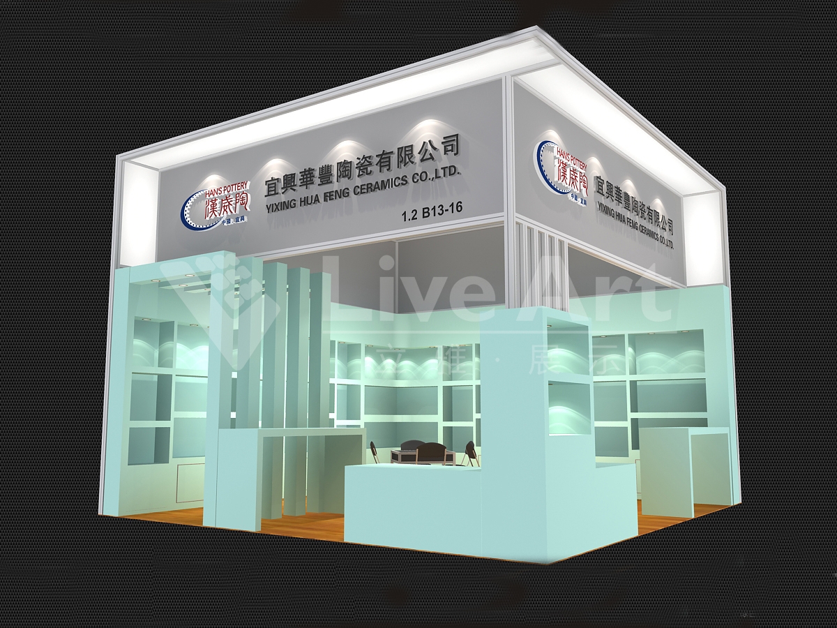 4華豐陶瓷展臺搭建:鋁型材+軟膜搭建展位框架,結(jié)合分柜式木料陳列柜