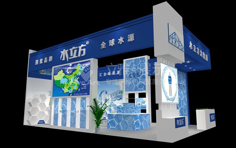 水立方礦泉,是一家集優(yōu)質飲用水開發(fā)定制、生產與銷售于一體的企業(yè)。本次展位設計采用藍色為主色調,輔以水立方形象商標,體現(xiàn)品牌天然、純凈、自然的本色。
