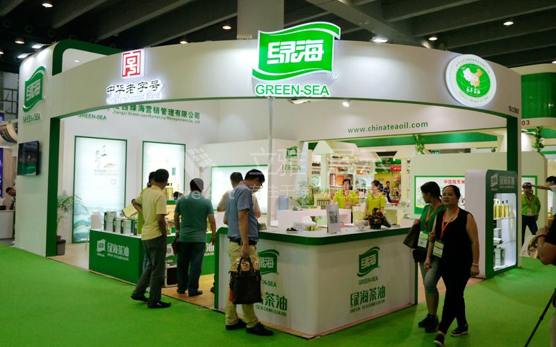 綠海,契合企業(yè)健康飲食的形象,以白色結合綠色設計展位,弧形門頭設計,視覺呈現(xiàn)半圓效果,簡潔干凈的風格。讓人留下健康清新的印象。