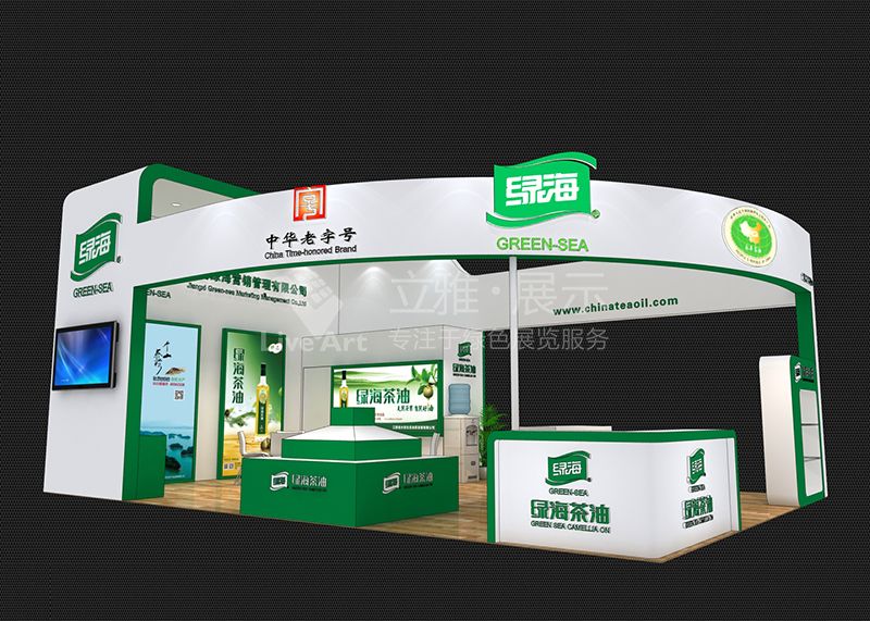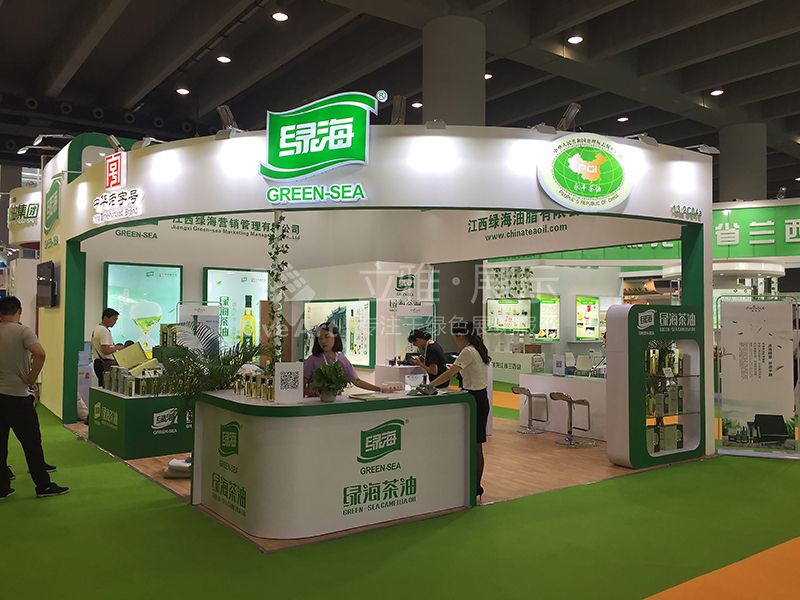 “綠海”牌茶油是山茶油行業(yè)內(nèi)獨(dú)家獲得“中華老字號(hào)”榮譽(yù)與“國(guó)家地理標(biāo)志保護(hù)”、“有機(jī)食品”雙認(rèn)證的產(chǎn)品,品牌知名度與市場(chǎng)銷售份額多年來(lái)保持在同行業(yè)前列。綠海茶油也是立雅的老客戶,本屆的參展展臺(tái)也和往屆一樣。半開放的空間同時(shí)兼顧洽談區(qū)的私密性和產(chǎn)品展示的開放性。