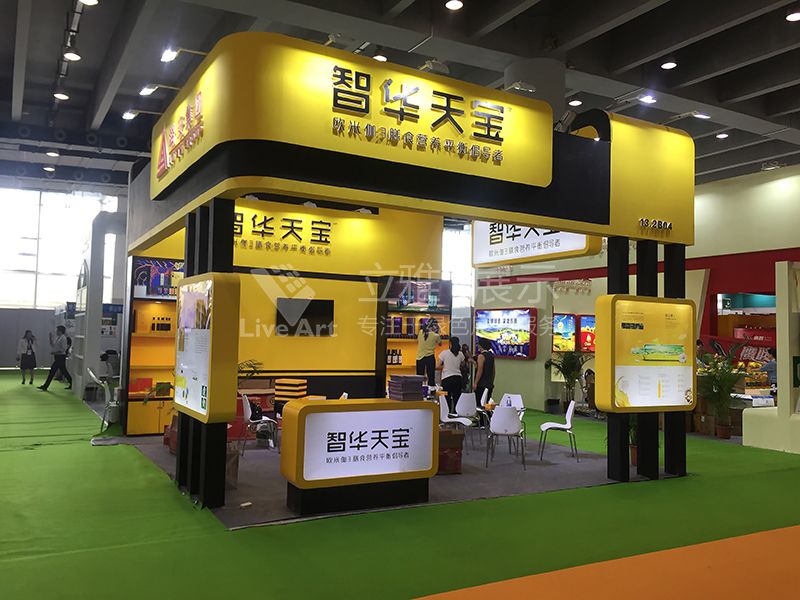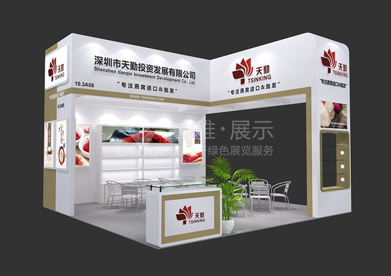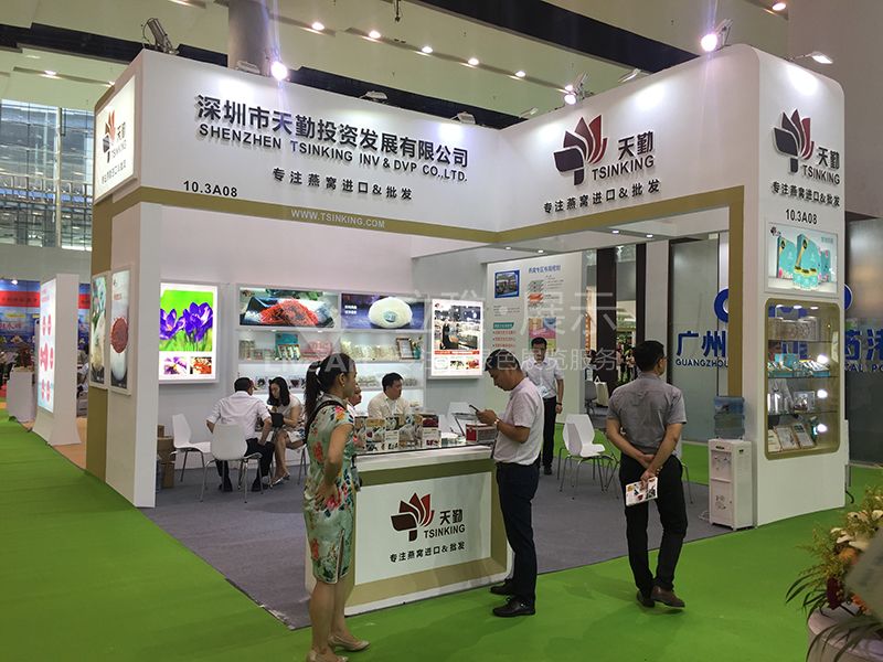 深圳市天勤投資發(fā)展有限公司是一家主營(yíng)燕窩、西紅花、海參、干貝、鱷魚肉干等高端食品的食品公司。立雅依據(jù)其企業(yè)形象及產(chǎn)品特點(diǎn),使用白色和深黃色作為展臺(tái)主色凸顯產(chǎn)品檔次。