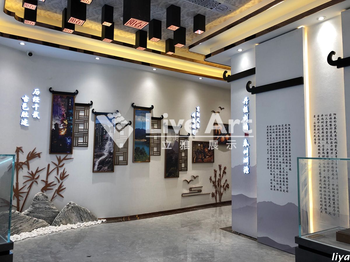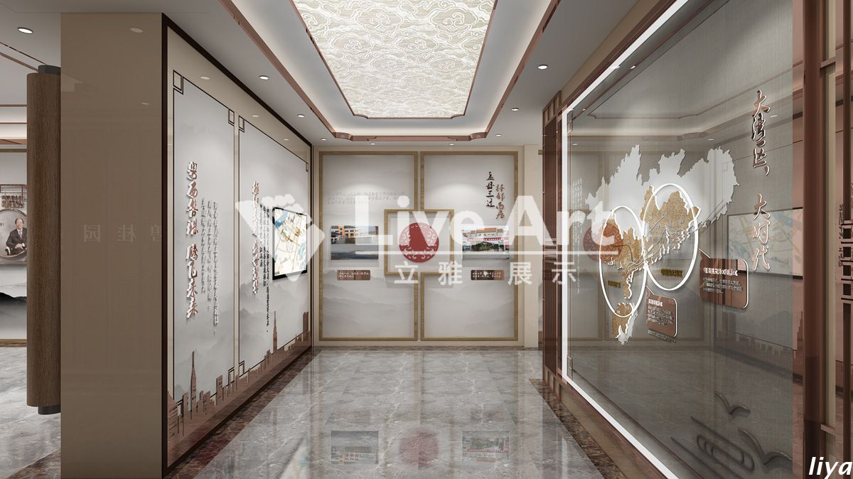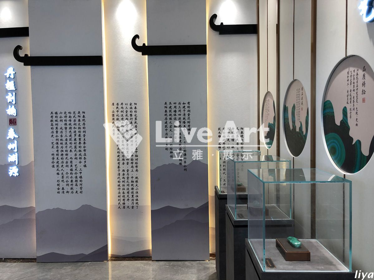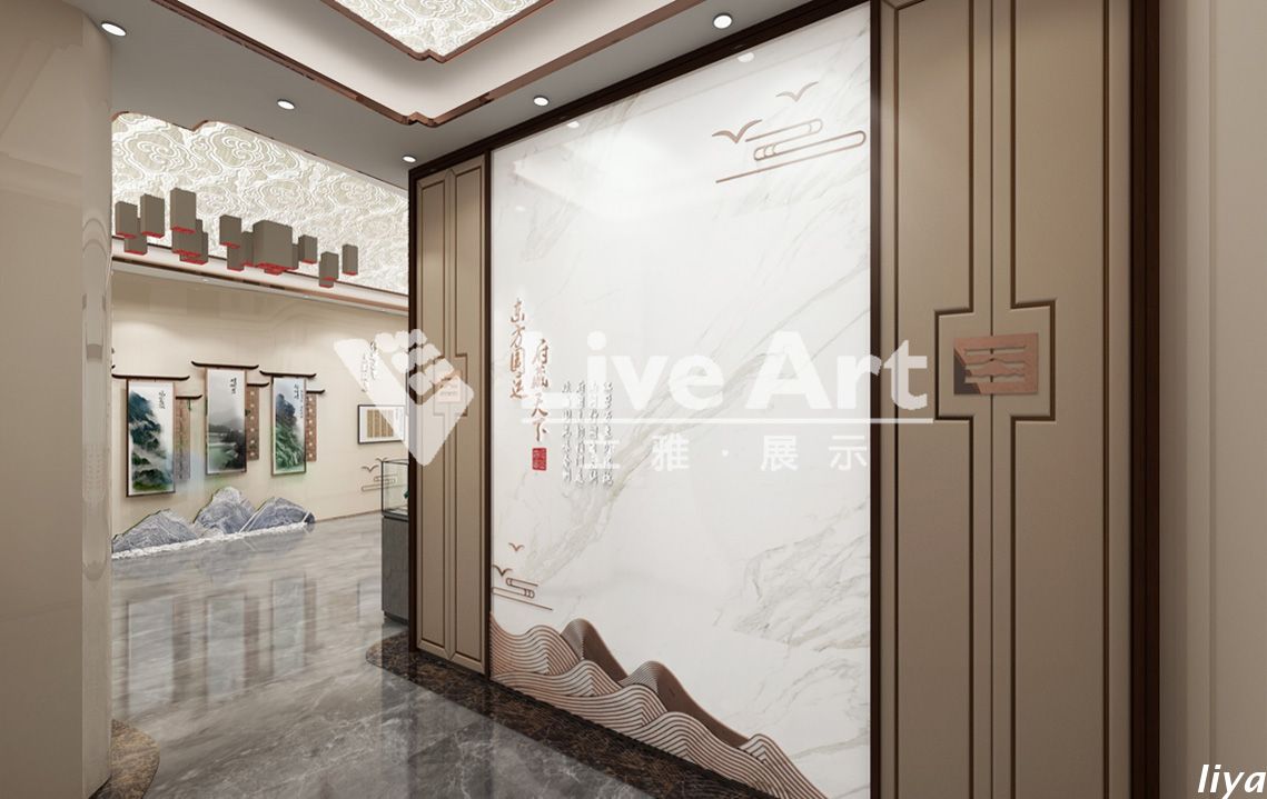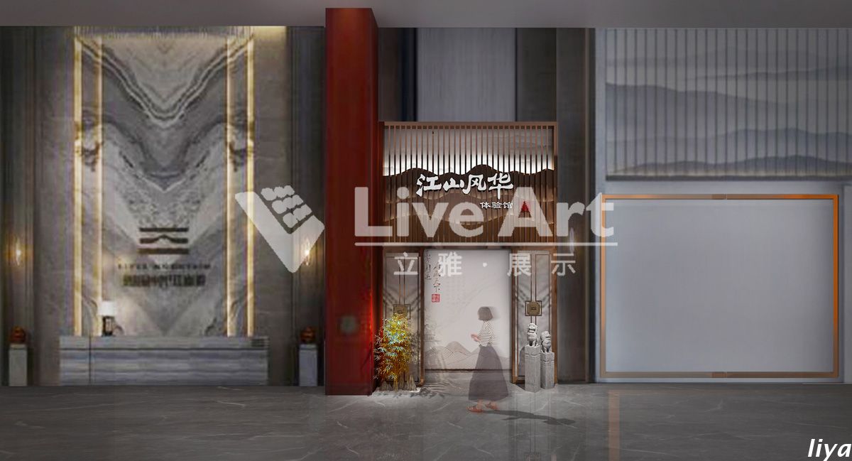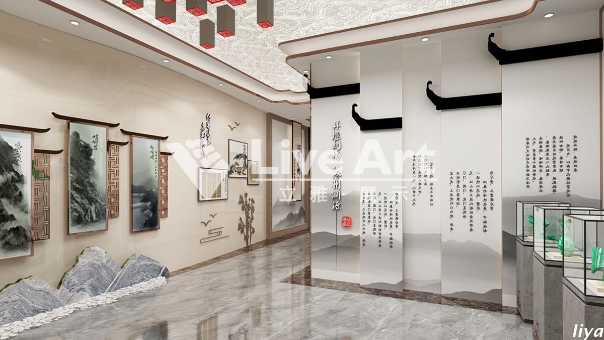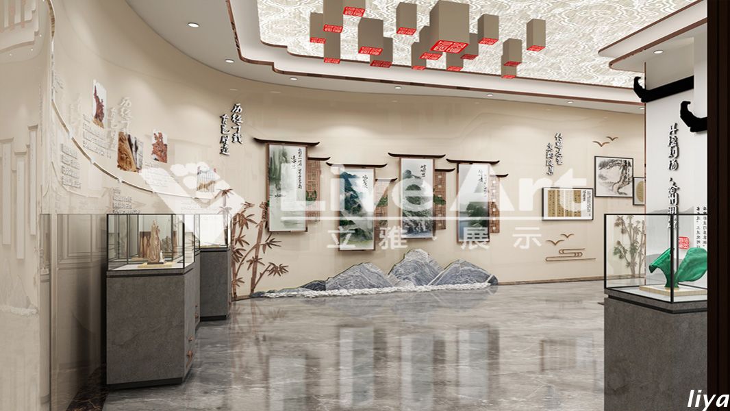 以根雕雅石,山水古韻中提取流線型的曲線元素貫穿,輔以代表山水的枯山水,營造具有強烈韻律感的展示空間。