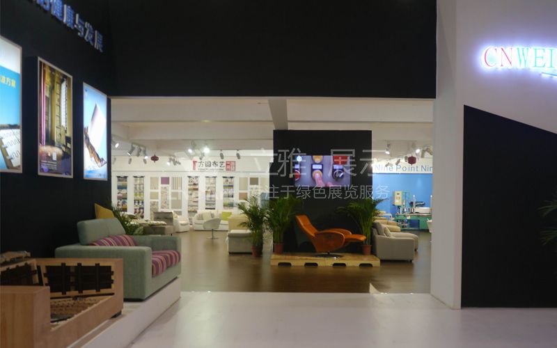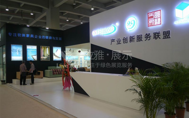 展臺搭建特色:偉宏家具展以木結構為主要材質搭建,五公分高地臺,亞克力發(fā)光標注品牌,設計玻璃墻面小隔房,壁墻掛結合軟膜燈箱,使黑白為主色調彰顯高貴大氣的同時不顯單調。